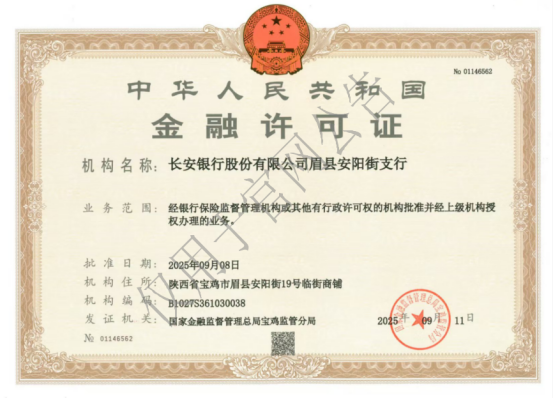 经国家金融监督管理总局宝鸡监管分局批准,新领长安银行股份有限公司眉县安阳街支行金融许可证,现予以公告: