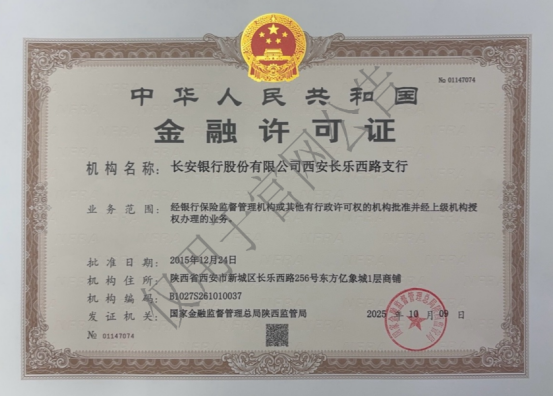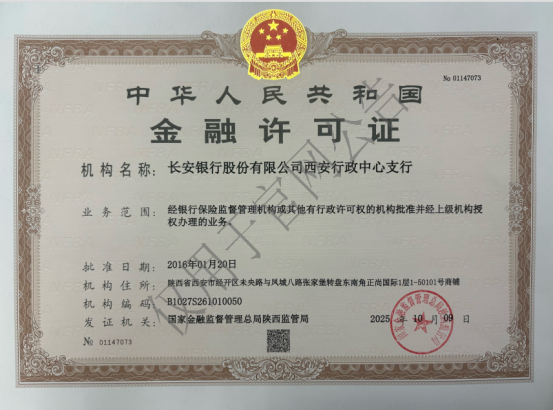 经国家金融监督管理总局陕西监管局批准,换领长安银行股份有限公司西安行政中心支行和长安银行股份有限公司西安长乐西路支行金融许可证,现予以公告: