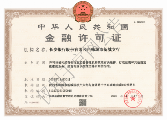 经国家金融监督管理总局渭南监管分局批准,换领长安银行股份有限公司韩城市新城支行金融许可证,现予以公告: