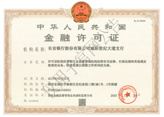 经国家金融监督管理总局咸阳监管分局批准,换领长安银行股份有限公司咸阳世纪大道支行金融许可证,现予以公告: