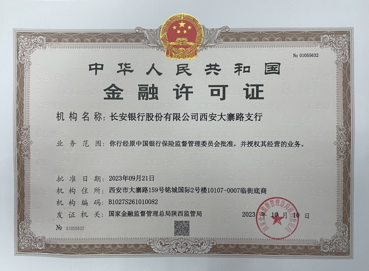 经国家金融监督管理总局陕西监管局批准,新领长安银行股份有限公司西安凤城六路支行和长安银行股份有限公司西安大寨路支行金融许可证,现予以公告: