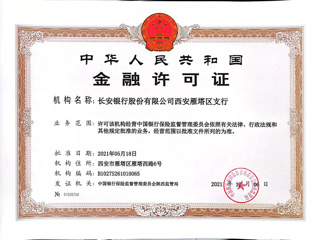 发证机关:中国银行保险监督管理委员会陕西监管局