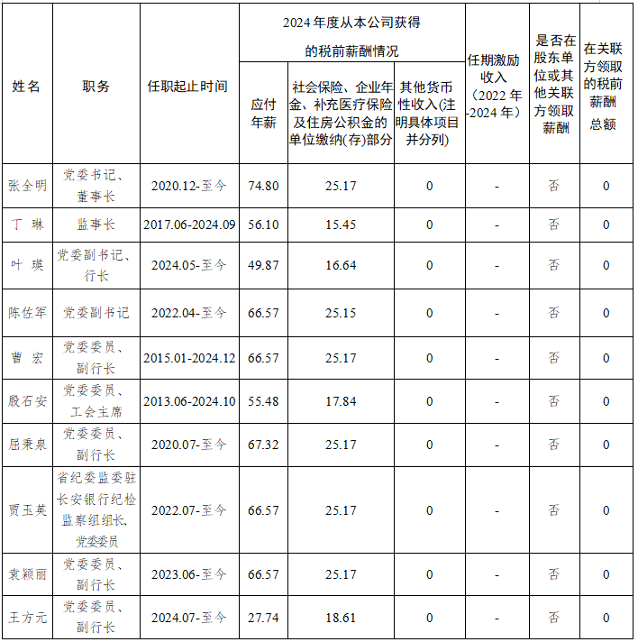 按照省委、省政府关于省属企业负责人薪酬制度改革的实施意见有关规定,现将长安银行股份有限公司2024年负责人薪酬信息披露如下: